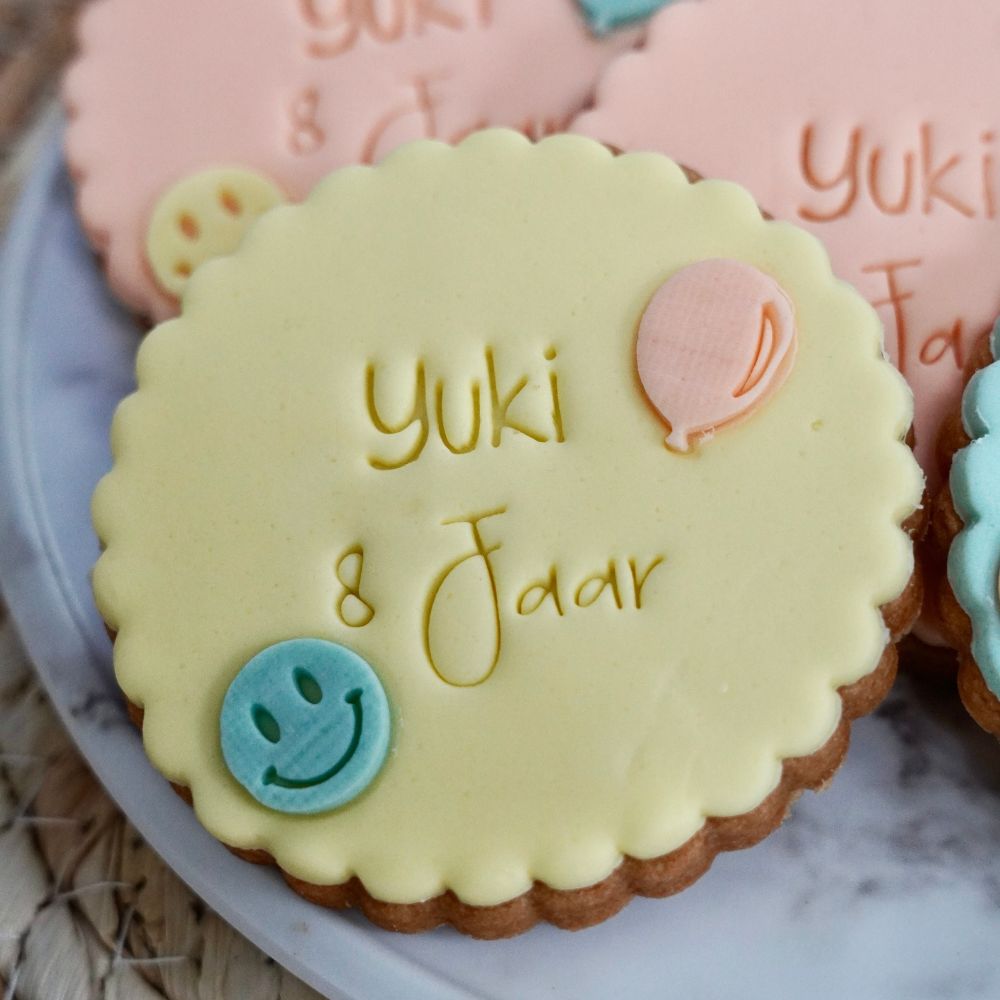 Koekjes op de foto zijn gemaakt door Lieke’s patisserie. Ze heeft de naam gestanst met de letterset handschrift (hoofdletters en kleine letters) en de koek is 7cm groot. De stempel ‘jaar’ komt uit haar privé collectie.